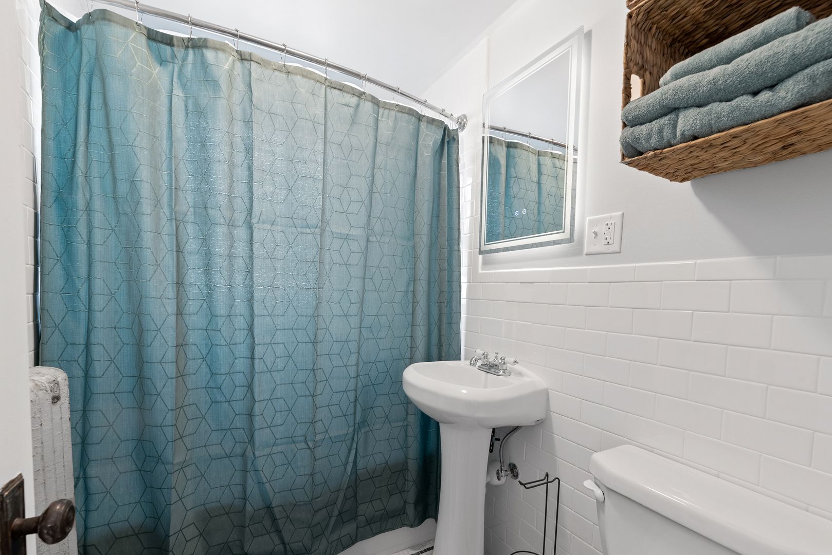 - New pedestal bath sink, reglazed bathtub, new toilet, backlit mirror and new wall tile.